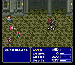 Garkimesra的防御高达50,而第一世界攻击最高的武器——Killer Bow的攻击力才49,按照FF5这种极其简单的减法运算,看上去似乎是没有一种武器能够对其造成伤害的。实际上,第一世界防御最高的怪物是Prototype,其物理防御高达100,但是,即便是我图中Galuf手上的那把武器,也可以对Prototype 砍出伤害值的。你有没有想过,Aim是可能Miss的?你有没有想过,为什么X-Fight对Blood Sword没有伤害惩罚?你有没有想过,为什么看似超强的Blood Sword打起来经常Miss,而完全不起眼的Giyamen Bell却总是每击必中?看到前面对于Chicken Knife和BraveBlade的讨论,也许是有必要谈一谈FF5中的武器种类的问题了。FF5系统之博大精深,简谐的美丽,一如所有的数学公式。极其简单的(Atk-Def)xMul的伤害值计算方法的背后,蕴含着关于武器(其实也包括魔法)中很多特殊的设定,也正是这些特殊的设定,才给我正在进行的无转职通关带来了冥冥之中的一线生机和希望。 一、武器种类 FF5中的武器种类一共有12种,其实大家看一下十二神器的列表就可以一一对应了 Swords: 以Excaliber为代表的剑类武器 Knives: 以Assassin Dagger为代表的小刀类武器 Spears: 以Holy Lance为代表的矛类武器 Axes: 以Rune Axe为代表的斧类武器 Rods: 以Wizard Rod为代表的杖类武器 Staves: 以Sage Staff为代表的棍类武器 Katanas: 以Masamune为代表的长刀类武器 Bells: 以Earth Bell为代表的铃类武器 Harps: 以Apollon Harp为代表的竖琴类武器 Bows: 以Yoichi Bow为代表的弓类武器 Whips: 以Firebute为代表的鞭类武器 Fists: 空手家的武器显而易见的是,这个归类可以直接从武器图标中看出来,这是按照武器的自然属性和可装备职业的特性进行的分类。几乎所有可以装备的武器皆可归入以上这12种武器中,只有3种特殊武器例外:Crescent, Rising Sun和Twin Lance,它们没有相应的图标表记。 但是,在计算伤害值的时候,这些武器的归类却发生变化,从代入公式的相关属性来分,最简单的大类只有3种力量型武器:包括Swords、Spears、Axes、Katanas、Fists 敏捷型武器:包括Knifes、Bows、Whips 魔法型武器:包括Bells、Harps、Staves、Rods 大体的分类是这样,不过在各类中都有一些特殊武器并不属于它们自己的类别,或者说计算方法有些特别。 力量型武器的特征: 1. 攻击浮动大,代入计算的攻击力一般为武器本身攻击力的1-1.125倍,对于Axes类武器,为0.5-1.5倍,对于空手家的拳头,浮动范围与等级直接相关,为等级的1/4。 2. 攻击倍率只和力量相关,为等级乘以力量除128取整后,再加2。 敏捷型武器的特征: 1. 攻击浮动小,代入计算的攻击力一般为武器本身的攻击力至攻击力+3