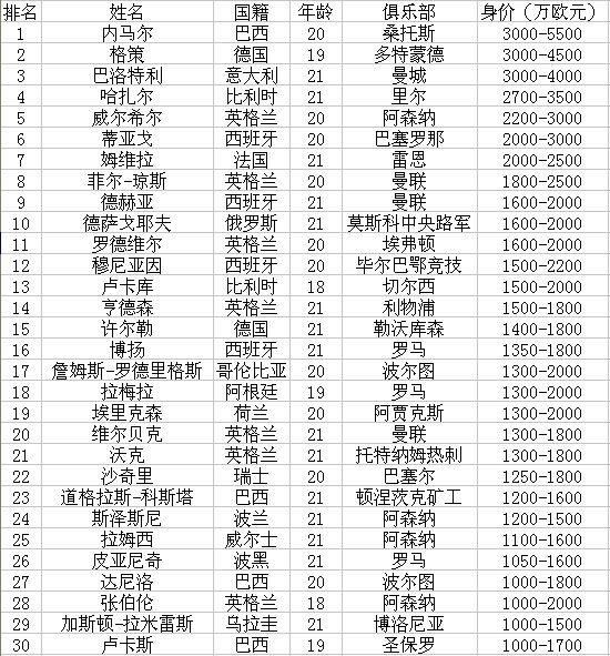 世界足坛30大最有价值年轻球员