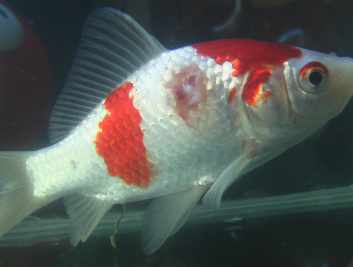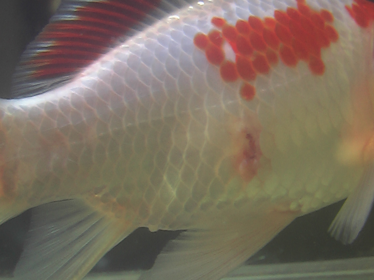 小缸隔离早晚在伤口处滴 一滴 30秒后放入缸中,每日换水(主缸里取),半个多月伤口就完全愈合了。