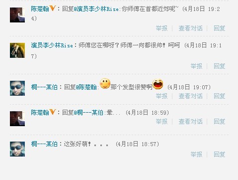 陈楚翰:回复@演员李少林Rise:嗯~在一起:)(2012-4-19 07:23) |