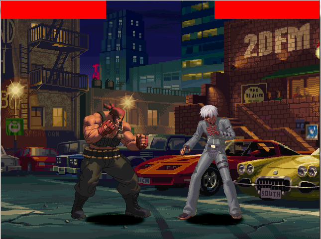 其实血条真没什么,你只需要一条长长的一张图片,比如说我上面的那个。然后导入到游戏里【图片必须是256色的BMP格式】,然后就OK了。至于角色格斗是被打击掉血什么的,系统自己会按你血条的长度的百分比进行减血。