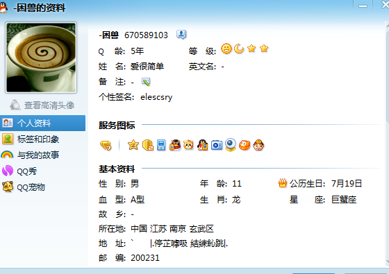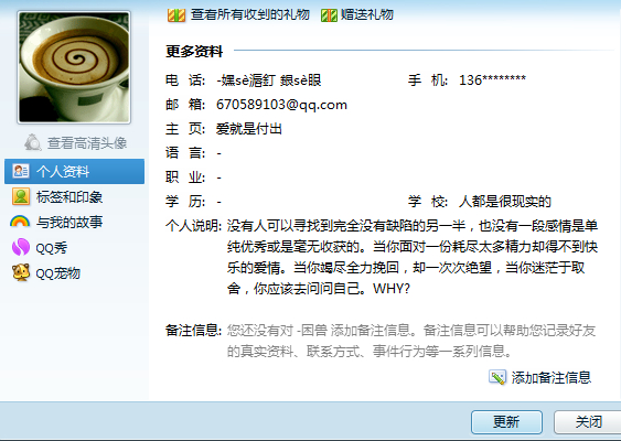 对话如上,一开始我只是怀疑,然后10点多聊完以后,她立刻换了头像。我就看了下资料,签名里有提到通通。于是我去群里问谁知道这个号,并且自己百度了下。但是没看出什么来。然后过了会
