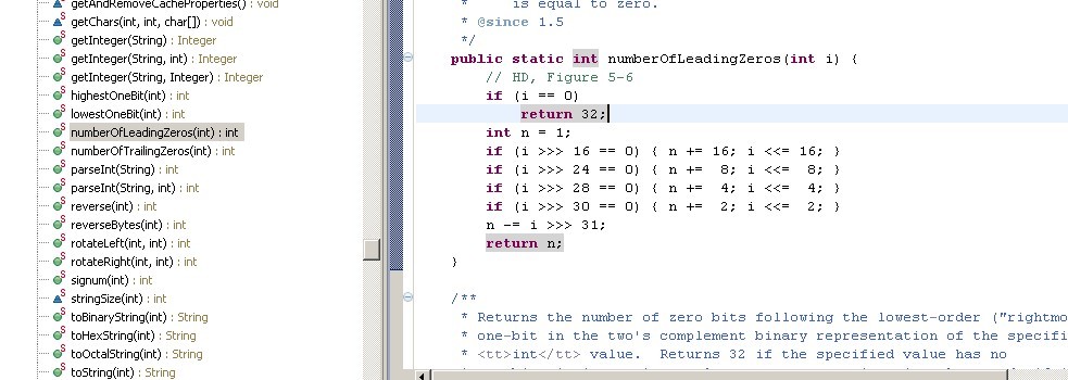 自己做完了不太完美看了一下习题答案是用Integer.numberOfLeadingZeros(int i) 方法知道位数的。请问 numberOfLeadingZeros(int i) 方法怎么实现,说说思路就行了
