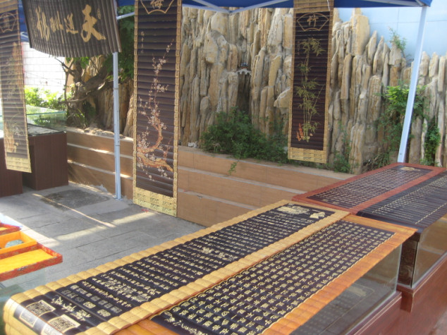 5月1日,我在七贤文化城的展会上,早上7点来到展会,摆好桌子,打好帐篷,将兰亭序,论语,三十六计,心经,还有弟子规摆到桌子上,柜子里面摆的是三字经,百福图,将兰亭序挂在帐篷的四方,中间一个竹简牌匾“