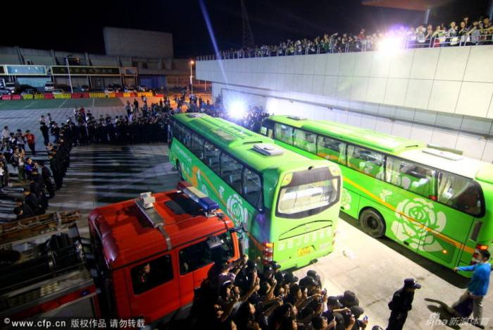 北京时间2012年4月28日,慈溪,2012美国传奇明星队中国行,赛后球迷围堵大巴。艾弗森似被热情粉丝阵势“吓到”。