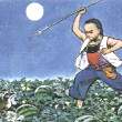深蓝的天空中挂着一轮金黄的圆月,下面是海边的沙地,都种着一望无际的碧绿的西瓜。其间有一个三十岁的少年,项带银圈,手
