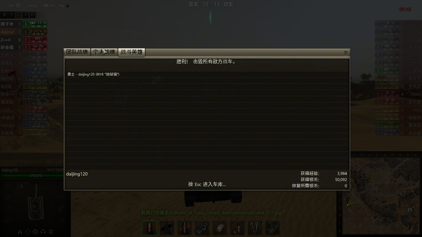 7级房以下地狱猫真是神车啊 像荒漠小镇这样有起伏地势又开阔的图 太适合地狱猫发挥了 满场跑 最后还打着了对面t29两次 我觉得对面t29一定很委屈 1000多血就那样烧光光了 不过七级车还不带灭火器。。。