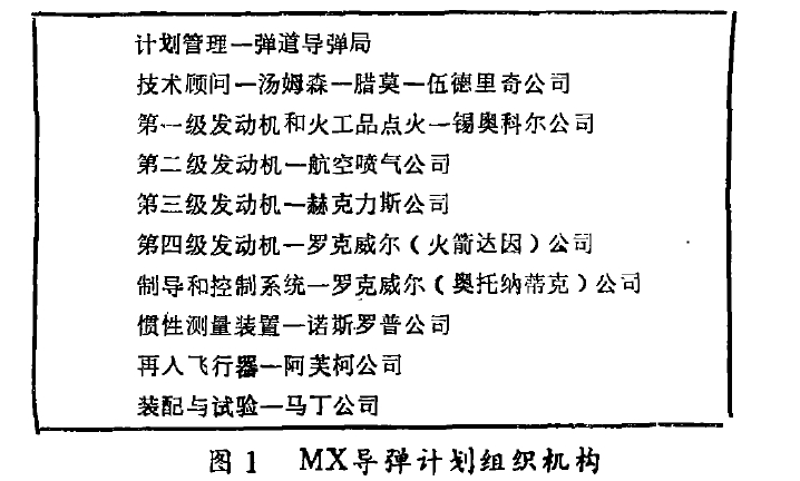 MX全尺寸的研制是在1979年9月开始的, 而计划在1986年开始装备部队。在全尺寸研制之前, 有一个为期18 个月的系统论证阶段和一个4 年的改进研制阶段。带有球窝(trapped ball )喷管的92 英寸( 2337mm ) 发动机在系统论证阶段之前已由赛奥科尔公司于1977年10月点火。空军弹道导弹局正在安排计划, 汤姆森一腊莫一伍德里奇公司(TRW) 是技术顾问。导弹的各种另件由各承包商提供, 没有主承包商, 其任务由弹道局完成。赛奥科尔公司是MX导弹第一级发动机、火工品点火系统和飞行终止爆炸系统的承包商。