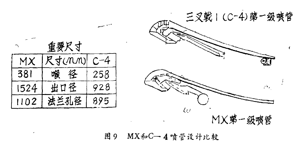其次是维碳/ 碳喉衬的使用。压力容器的设计如所示。设计方案跟1977 年10 月试验的92 英寸研制发动机和1979 年l月爆破的同样壳体相同。航空喷气公司努力实施的MX 导弹第二级发动机先进研制方案( ADP ) 也使用了该设计方案。对于MX导弹, 将要求改变树脂以取得令人满意的老化特性, 也需要研制裙部同压力容器的连接方法, 以适应把导弹底板的发射载荷传递到后裙上。另外, 还必须研究能保证爆破强度重现性的工艺。MX导弹喷管的设计实质上是三叉戟I导弹喷管的直接放大, 以适应燃烧室压力、直径和排出气体组分的变化。热解石墨层叠式喉村已由三维碳/ 碳整体喉衬所取代。1978年, 空军火箭推进实验室( AFRPL ) 在超级高内压喷管发动机上试验过喉衬稍小一点的三维碳/ 碳喉衬。MX 导弹的燃烧室压力将比超级高内压喷管发动机每平方英寸高出好几百磅。此外, 还必须研究重现性好的制造三维碳/ 碳喉衬的生产工艺。在喷管研制中没有发现其它的问题。