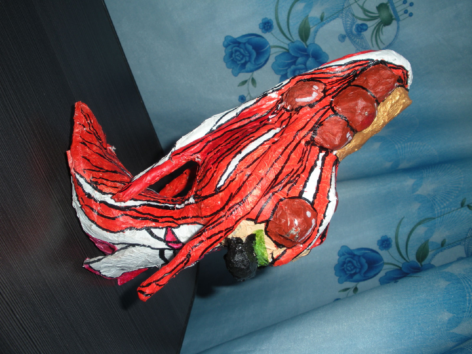 用报纸做好之后上色而成……