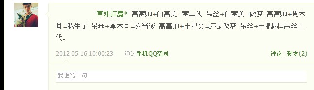 暴发户:这里的暴发户指的是广义上的富一代或官一代(产地一般为帝都,魔都,吃省,大江苏,大浙江等)这类人群生自五六十年代,一般是高富帅的父辈。