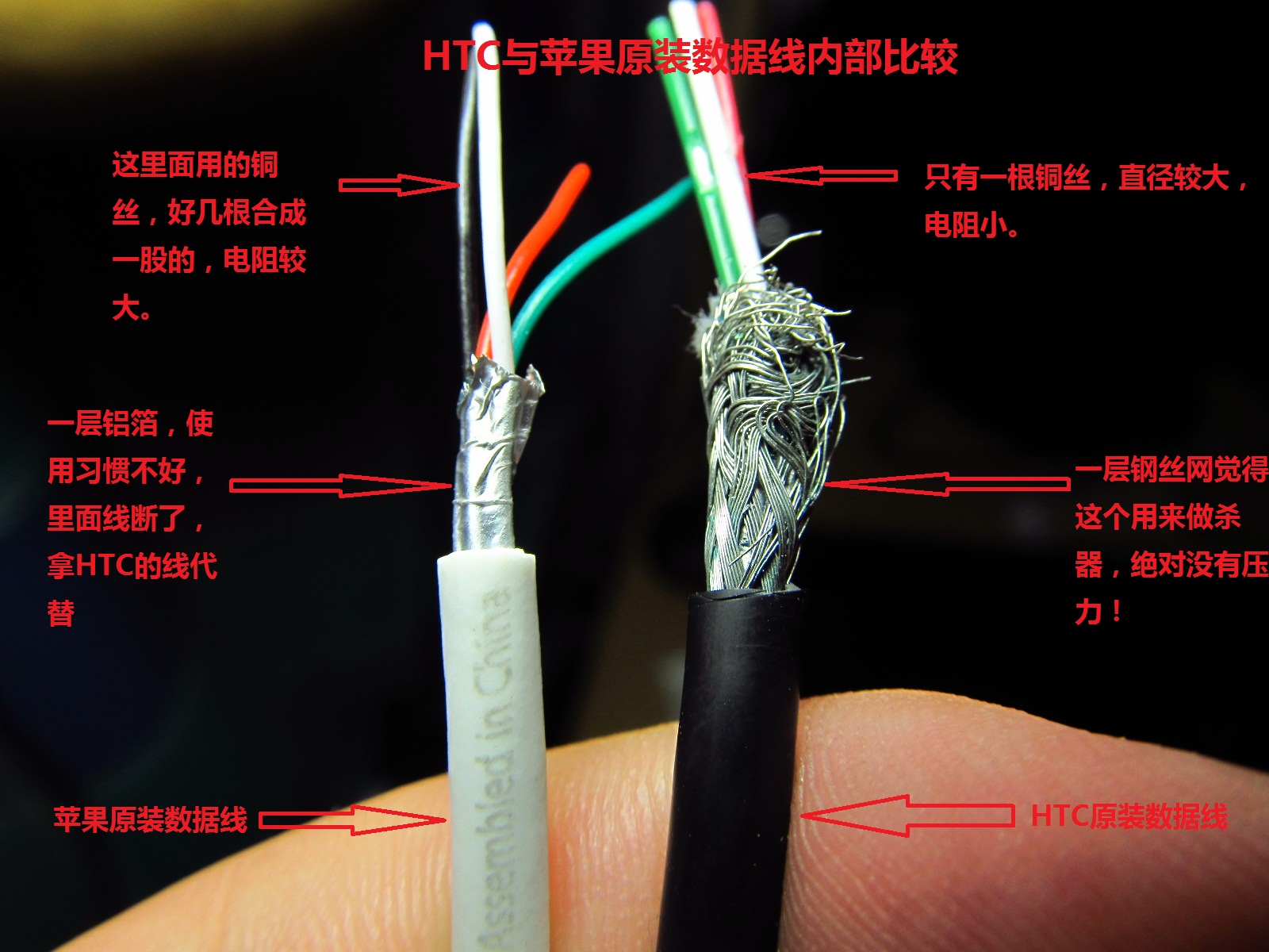 左侧苹果原装数据线··右侧HTC原装数据线···HTC数据线里面还有几根加强的丝线···相比之下···HTC的配件···至少这个数据线让人不由得肃然起敬啊!