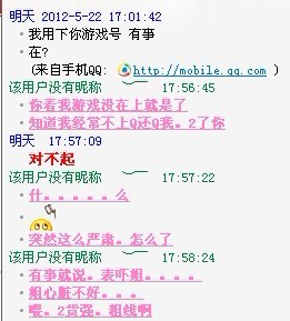 刚才无聊开Q就看见这货Q我。我还以为他要干嘛。结果突然一句“对不起”让伦家半天没回过神来。当时还想。这货不会是上我号把我宠物给放了吧。