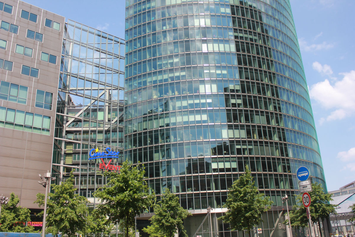 波茨坦广场~附介绍:波茨坦广场(Potsdamer Platz)是德国柏林中部一个重要的广场和交通枢纽,位于勃兰登堡门和德国国会大厦以南大约1公里,靠近Tiergarten公园的东南角,以其西南方25公里处的城市波茨坦命名,此处原是前往波茨坦的旧道路通过柏林城墙处的波茨坦门。曾经有一个多世纪的时间,波茨坦广场是欧洲最繁忙的交通枢纽和商业中心。第二次世界大战期间,此处被彻底摧毁成为废墟,随后在冷战时期,柏林墙在其原址上将其分为两半。但自柏林墙倒塌以后,再度发展为该市闪耀的新的核心和新柏林最显著的标志。主要建筑包括索尼中心和DB(德国铁路股份公司)大楼等。