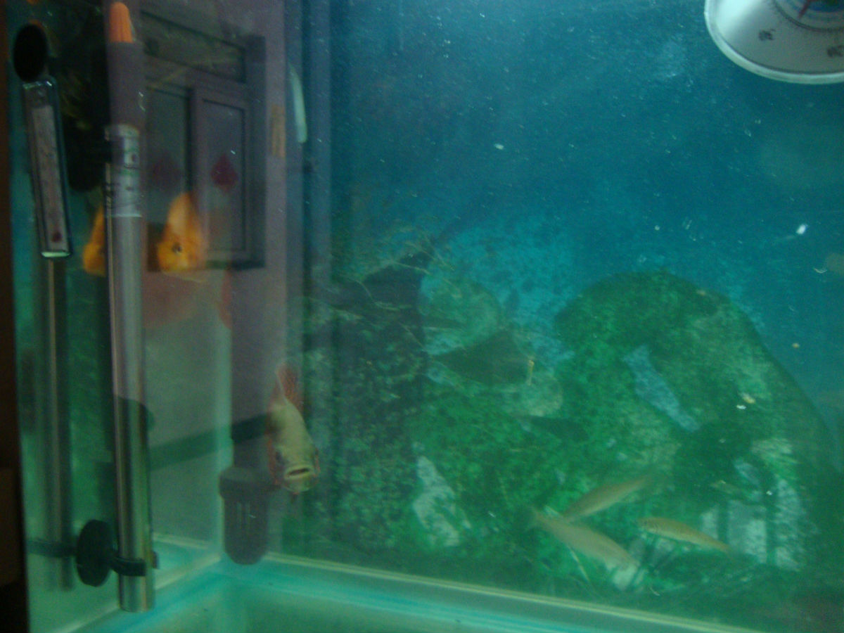 新手。先弄个小缸练练手。现在还有1条地图和2条鹦鹉了。是元老,买缸时就来了,后来换的猫。地图、砍刀、等等都死了。刚才刚喂了干虫,水有点浑,平时水会比这个清点,各位教教俺咋弄的更好!