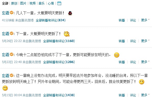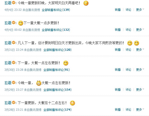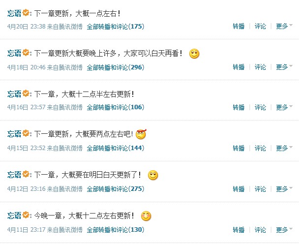 忘语很是敬业的,看微博内容就知道了,基本全是关于凡人更新的~
