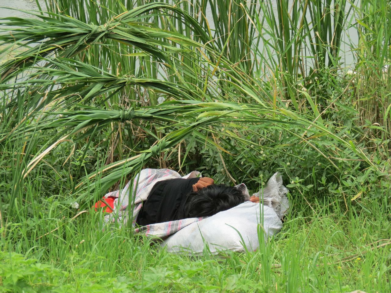 这是今天在公园见到的,他是一个流浪汉,多么渴望有一个家。用河边的草扎成四束也勉强算一个家吧?