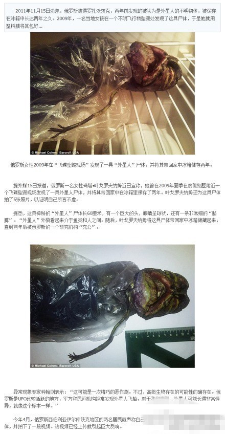 【俄罗斯女孩用冰箱保存2年处星人尸体】2011年11月15日俄罗斯彼得罗扎沃茨克,两年前发现的被认为是外星人的不明物体,2009年,一名当地女孩在一个不明飞行物坠毁处发现了这具尸体,于是她就用塑料膜将其包好放入冰箱中两年之久。目前,它是不是外星物体还不得而知。