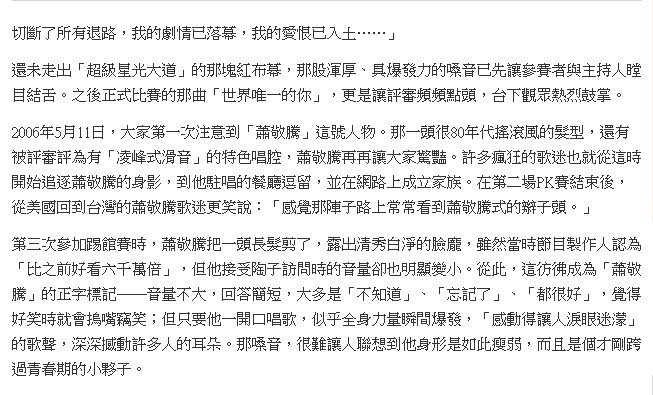 我也仔仔细细的看完了,害我又哭一次。。。。如果不是因为是写敬腾的,这么多字,而且还这么小的字,我肯定是不看的,就因为是写敬腾,还是一咬牙看完了。。哭死我了。。这孩子真心让人心疼吖。。。