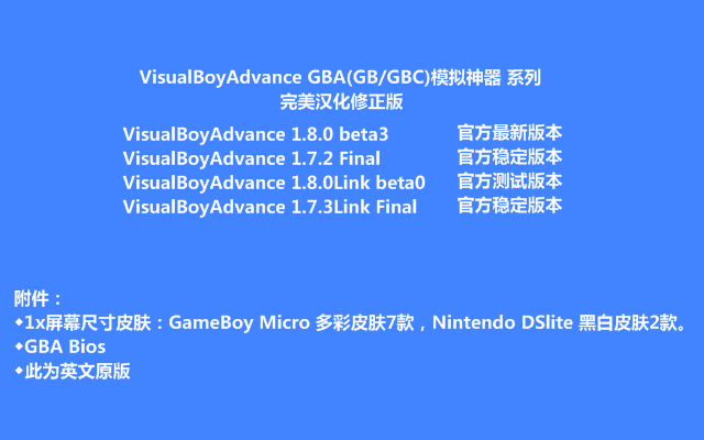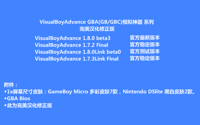 ◇修正 VisualBoyAdvance 1.7.3Link Final 的备注为“官方稳定版本”(发现稳定性、兼容性强)