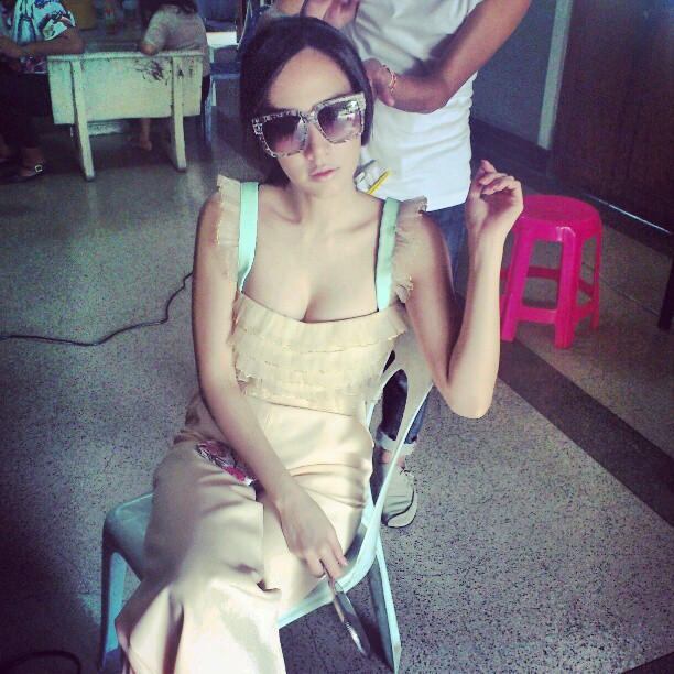 拍戏之余还不忘臭美。。。