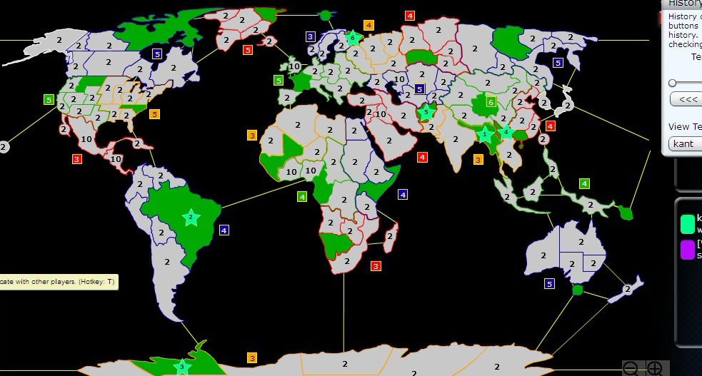 大致分析一下情况,猜测降物君会走北欧开局,于是在印度放一个前置攻击点,主要部队放在南美作为开荒,因为巴拿马跟西非都是10的废土,前期开荒非常有利,也不会被人打扰;除非降物君猜到我会这么开局,用2+1开局,把1放置在北美;否则我印度部队会率先攻向他兵源地