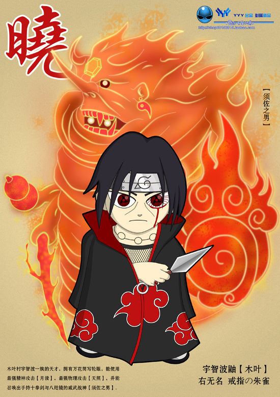宇智波佐助的兄长,为人沉着冷静。成为叛忍前,十三岁就担任木叶忍村的暗部分队长,才华横溢的他,一直被称为“天才忍者”,家族中的骄傲。但在一个晚上却突然将宇智波一族几乎全灭后,加入“晓”组织。他的弟弟宇智波佐助自始不惜一切以杀死他为目标,为族人复仇。其实一切都是为了二助子.