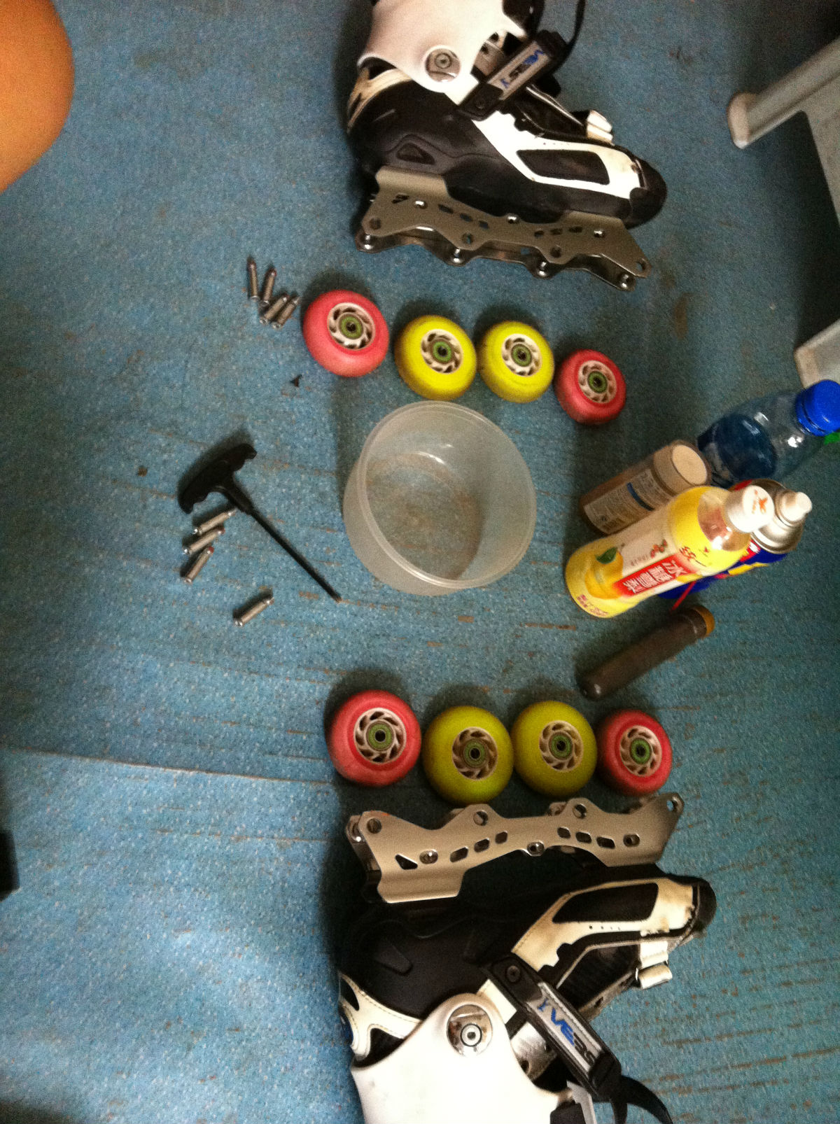 准备工作。。。一瓶润滑油,一瓶WD-40,一瓶稀料,一个脉动空瓶子,一个饭盒,哈哈