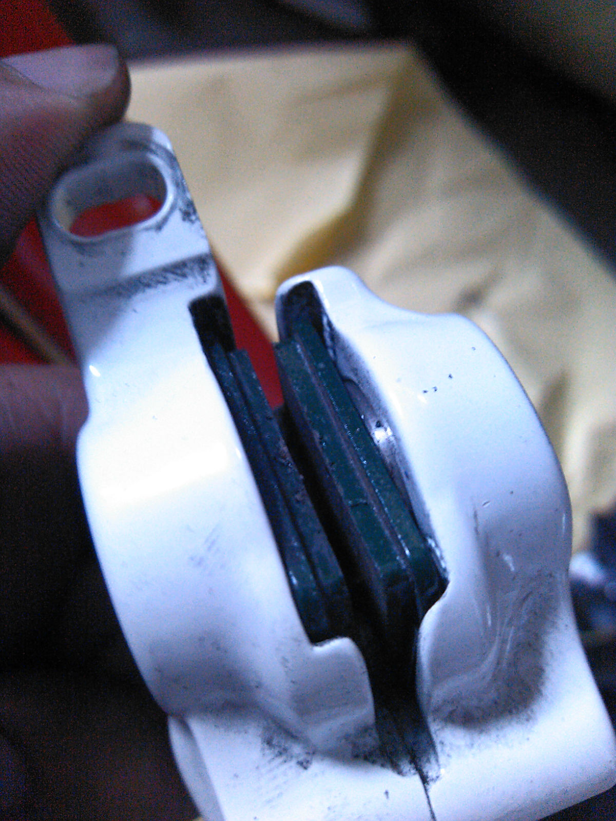 前面不能向后面一样轻易抱死,要使用很大劲 才能抱死(用同样的力气 后面抱死 前面稍微用力就能推着走)初步问题 发现图中红色的地方没有对齐 后面的油碟是很平整的 挑战者300 2013款 15天上过一次山小摔了一次 网购 只能网上求助了