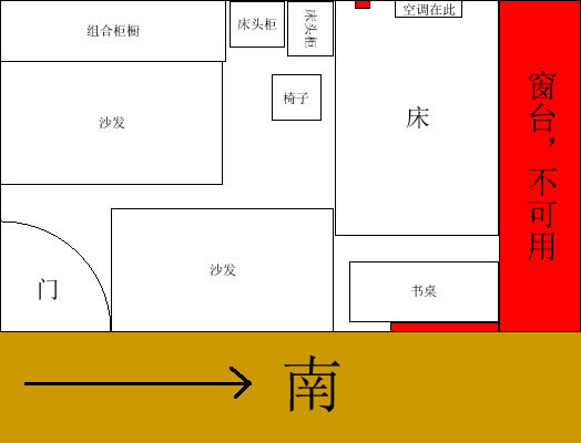 这是目前我房间的图,看起来比较乱哈……每个零件都已经画好了,现在的要求是空调不能直接对着床和书桌吹,红色的是不能放的,有插座或者是高台影响。就是实在不知道怎么排所以画了个图求高人指导…………顿首拜谢