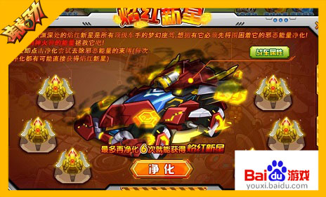 来自罪恶深渊深处的焰红新星是所有顶级车手的梦幻座驾,想拥有它必须先将围困着它的邪恶能量净化!只有羽神火种的力量才能做到。最多净化六次,就一定能够拥有这部战车!