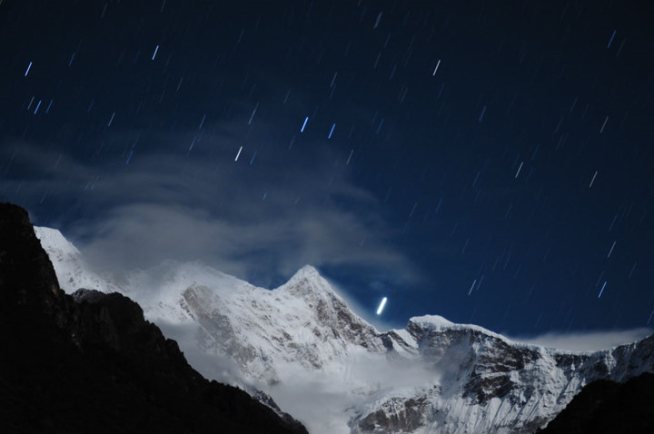 中国西藏。南迦巴瓦峰】光圈F8左右,ISO调到最小值,使用B门,曝光时间大约在10分钟左右,因此可以看见星轨