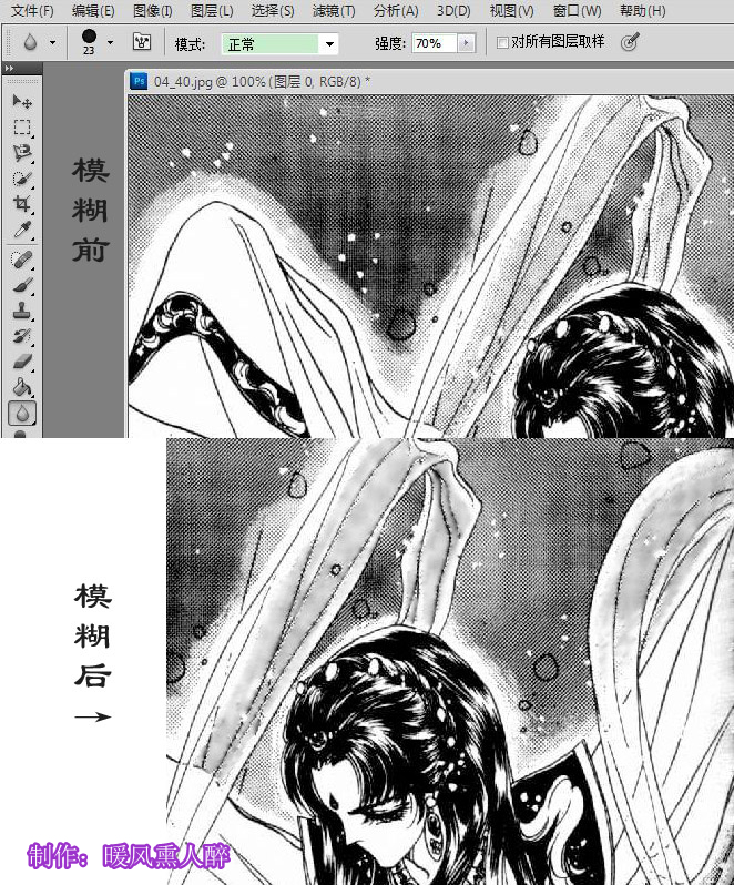 第二步,模糊网格。专门针对漫画线稿,有阴影的网格部分都需要模糊,注意不要压到主线条。这里偶只把要上色部分的网格给处理了一下,其它背景没打算上,所以没有模糊。