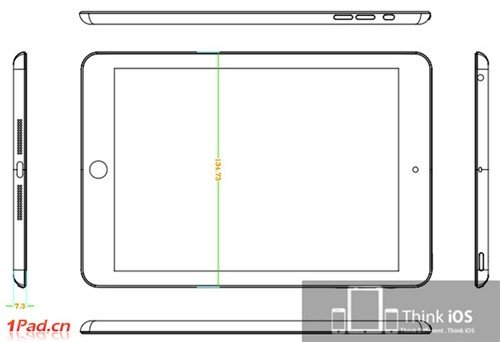 另外,图纸上显示该设备宽度为134.73mm,这样看来其屏幕的尺寸应该是在7.87英寸左右。而该设备厚度仅为7.3mm,非常的纤薄,这个厚度比7.6mm的爱可视发布G10 XS还要薄。如果iPad mini真的仅有7.3mm的厚度的话,那么无疑它将成为目前最薄的平板电脑。