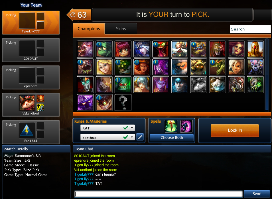 (3个月前跟别人抢teemo玩。。我抢不过他。。。之后找人3人黑。。让那个后来的秒了然后我最后选他换别的我再选。。)
