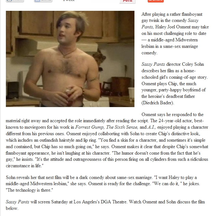 After playing a rather flamboyant gay twink in the comedy Sassy Pants, Haley Joel Osment may take on his most challenging role to date — a middle-aged Midwestern lesbian in a same-sex marriage comedy.
