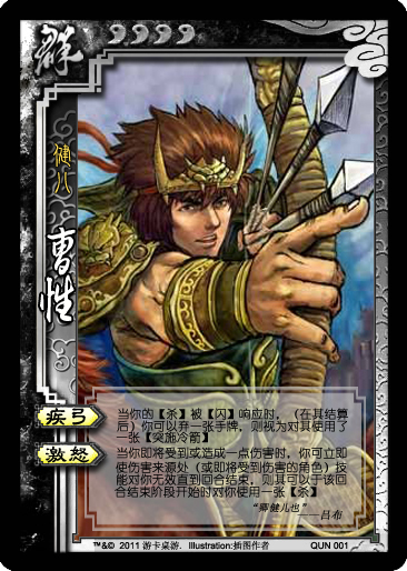 设计思路:曹性是吕布帐下郝萌的一将,当郝萌反叛时亲手斩郝萌一臂,后杀之。之后代替了郝萌的位置,郝萌反叛时曹性曾说陈宫也参与了反叛。演义中后于夏侯惇一战中,冷箭射中夏侯惇左眼,然后立即被夏侯惇斩杀。【疾弓】技能是说曹性善用弓箭,剑术精准,一箭出不伤则亡,也和新设计的锦囊相联系。技能强度略高于庞德的【猛进】,但是距离却是硬伤,如果你要吐槽为什么一个用弓箭的会缺距离?黄忠表示我躺着也中枪。