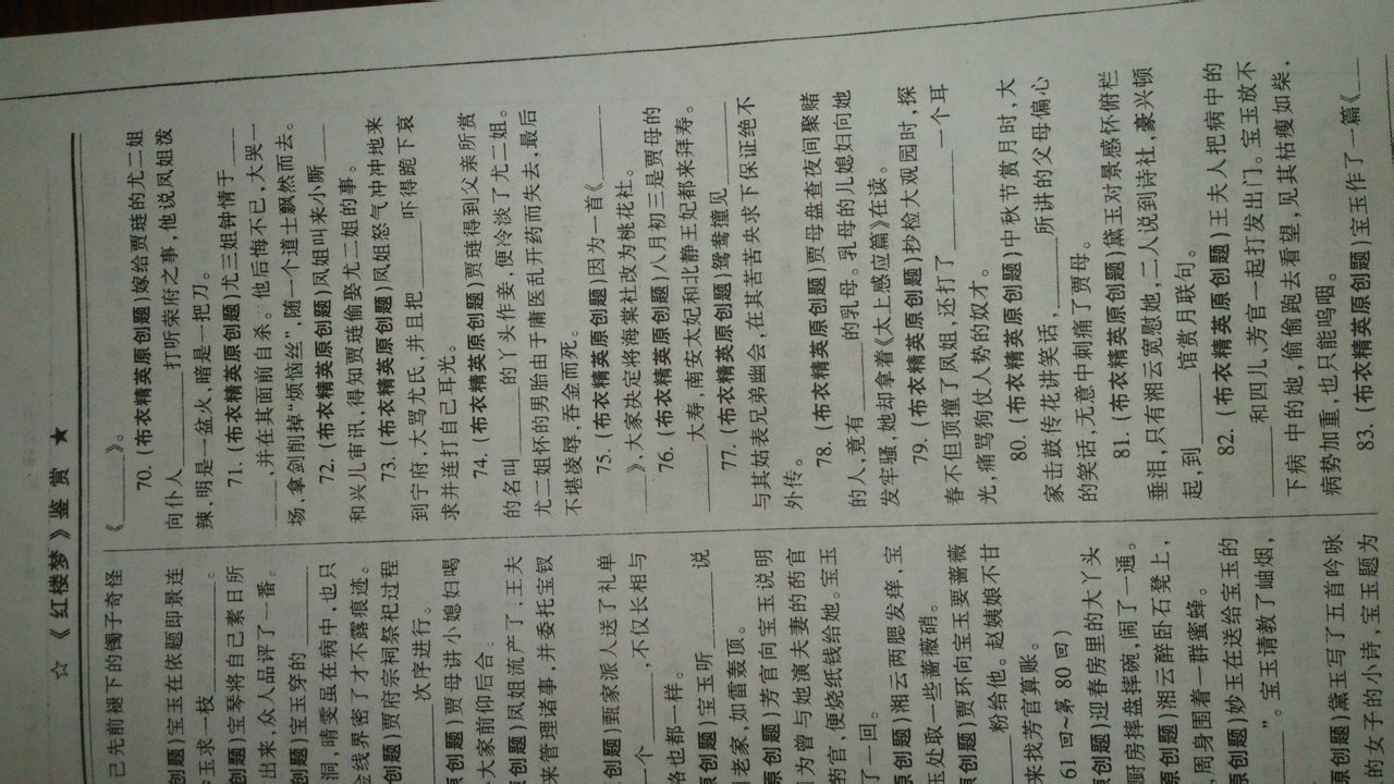 55红梅 56怀古绝句 57雀裘 58不知道 59尿 60探春 61宝玉 62紫鹃 63不知道 64莺儿 65茉莉粉 66司棋 67芍药 68槛外人 69五美吟