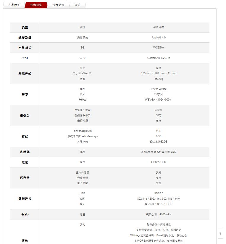 MediaPAD 7 Lite官网发表的参数: