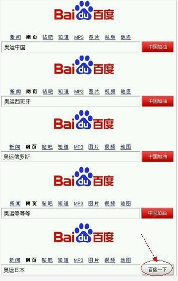 上百度搜,奥运之类的都会出现中国加油,唯独搜奥运日本没有,哈哈啊哈哈哈哈