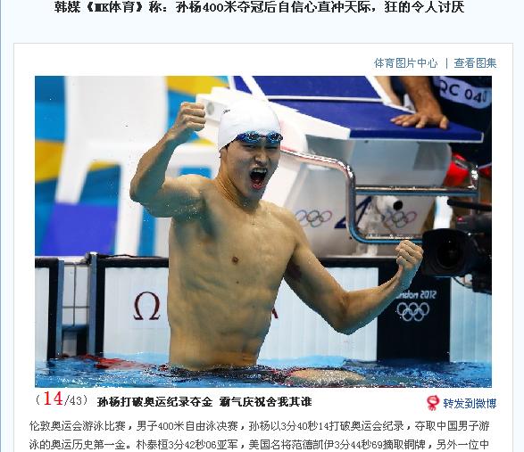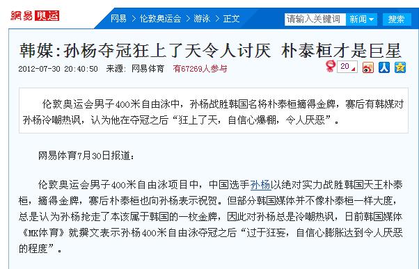孙杨在28日举行的英国伦敦奥运会男子400米自由泳项目中夺得金牌,而韩媒称“孙杨在赛后接受中国媒体采访时自称‘朴泰桓在400米项目上永远不可能战胜我’。”(事实证明,孙杨在赛后根本没有说过这样的话)随后韩媒更是表示,“孙杨还有在2010年广州亚运会男子400米自由泳项目中被朴泰桓击败,丢掉金牌的痛苦记忆,难道他现在都不记得了吗?而孙杨在本届奥运会400米比赛中触壁夺冠后的咆哮就是因为这个吧。”
