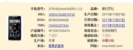 回复 @空天石隼 : 串号 358989040756944 生产地 印度 销售地 AE 生产日期 2012-03-01 交货日期 2012-03-20 保修截止 2013-03-19,