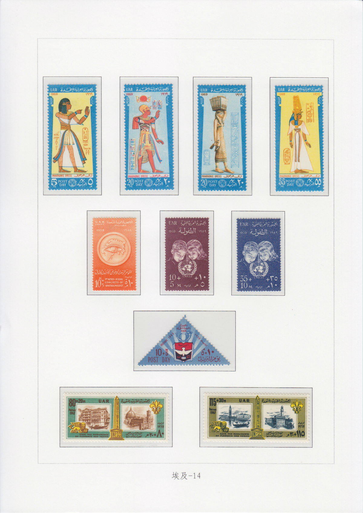 1958-1970年发行的附捐邮票,票面先后印“UAR EGYPT”(1958)、“UAR”(1959-1964)、“UAR POSTAGE”(1965-1970)。