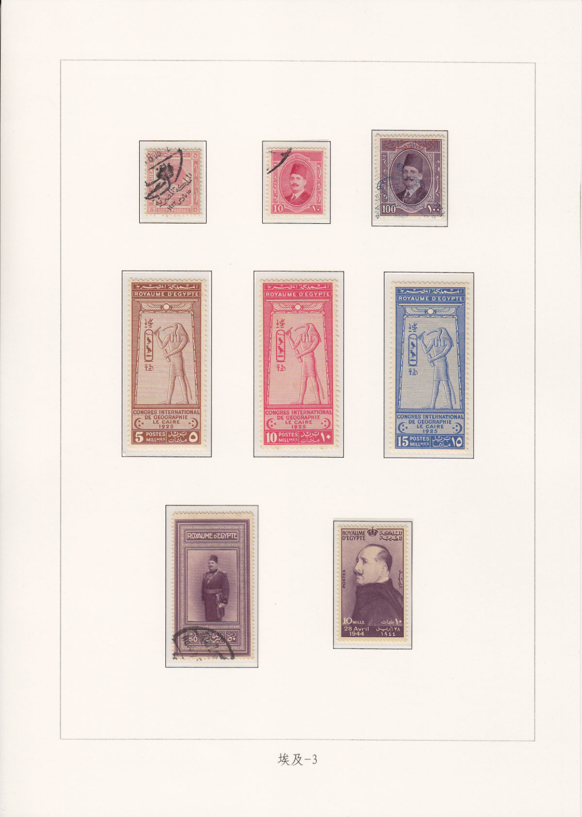1922年2月英国承认埃及为独立王国,同年10月用英**护国时期邮票加盖阿拉伯文“埃及邮政”和王冠图案继续使用。1923年开始发行特印票,票面只印阿拉伯文;1925开始,票面文字除阿拉伯文字外,同时印上法文“ROYAUME D'EGYPTE POSTES”(埃及王国邮政)、“EGYPTE POSTES”(埃及邮政)、“POSTES D'EGYPTE”(埃及邮政),有些邮票未印“POSTES” (邮政)。只有1936年印过一次英文“EGYPT POSTAGE”(埃及邮资)。