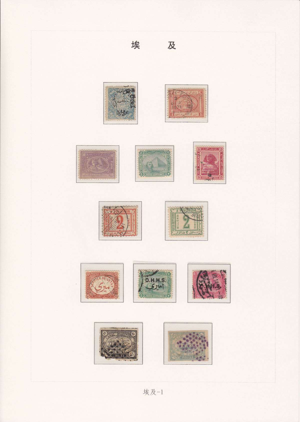 1893年发行1枚公事邮票,铭记为法文“埃及公事邮票”(POSTES EGYPTIENNES SERVICE DE L'ETAT);1907年在常规邮票上加盖英文“O.H.H.S”()和阿拉伯文“公事”;1913年在常规邮票上加盖英文“O.H.H.S”()