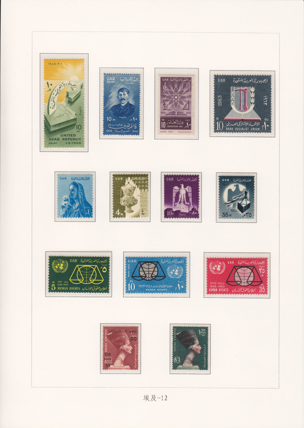 1958年2月1日埃及共和国和叙利亚共和国合并组成阿拉伯联合共和国,邮票仍各自发行。1961年9月28日叙利亚推出阿联后,埃及仍沿用“阿联”称号,直至1971年9月1日改名。