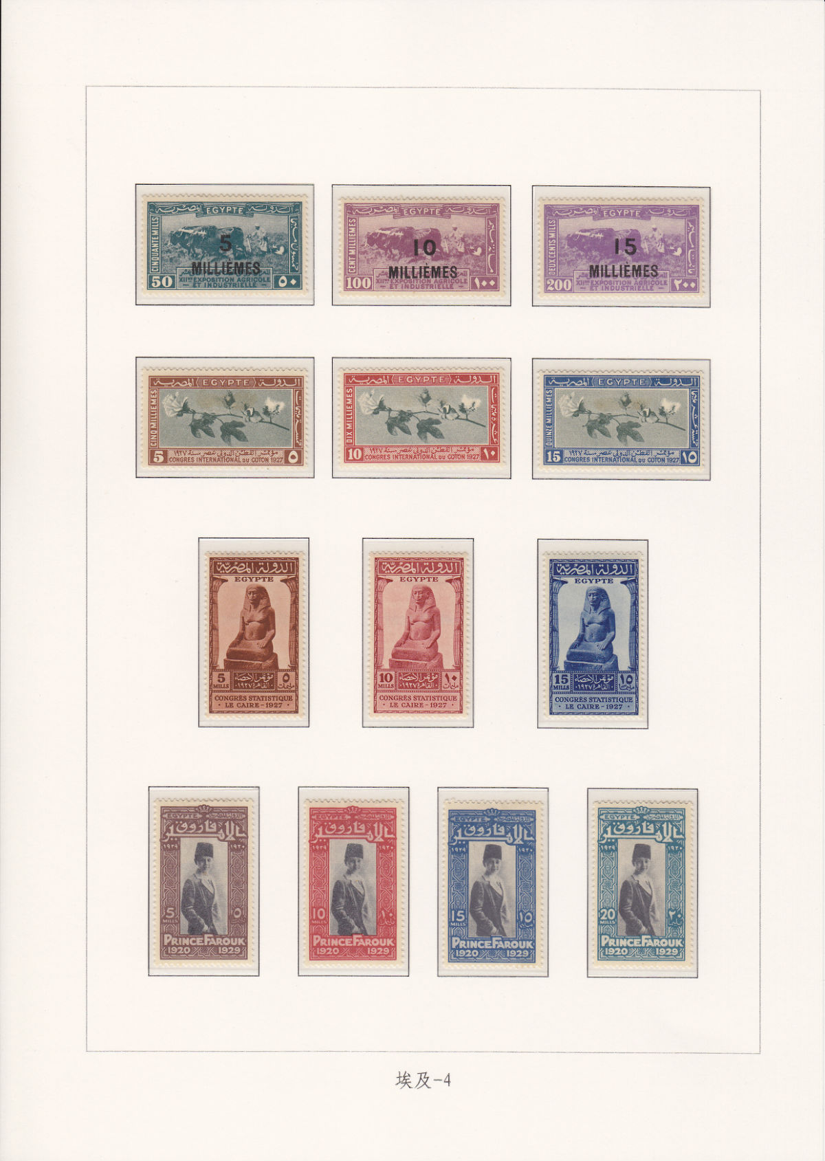 1922年在奥斯曼和英**护国时期欠资邮票上阿拉伯文“埃及邮政”和王冠图案继续使用,1927年开始发行特印票,票面印有法文“埃及欠资邮政”(POSTES EGYPTIENNES A PERCEVOIR)。