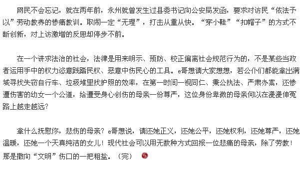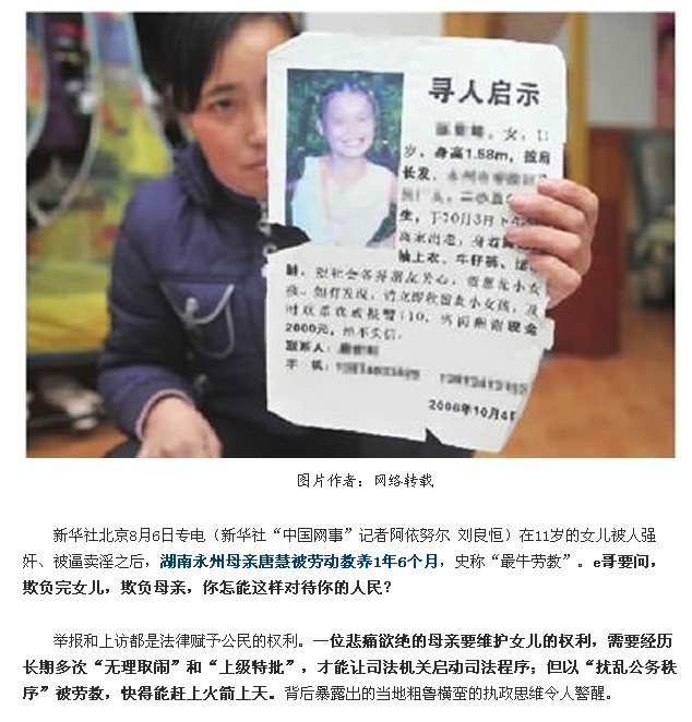 不过,日前,因不满永州司法机关对该案的处理,曾多次**的乐乐母亲唐慧被以“严重扰乱社会秩序,造成了极坏的社会影响”的名义送进劳教所,引起全国舆论一片哗然。