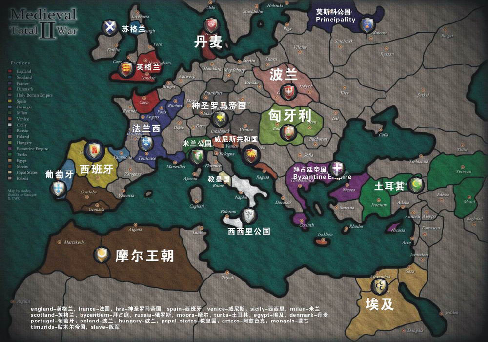 游戏的主要部分——帝国战役的开局各势力分布图 熟悉欧洲中世纪历史的吧友应该不会陌生