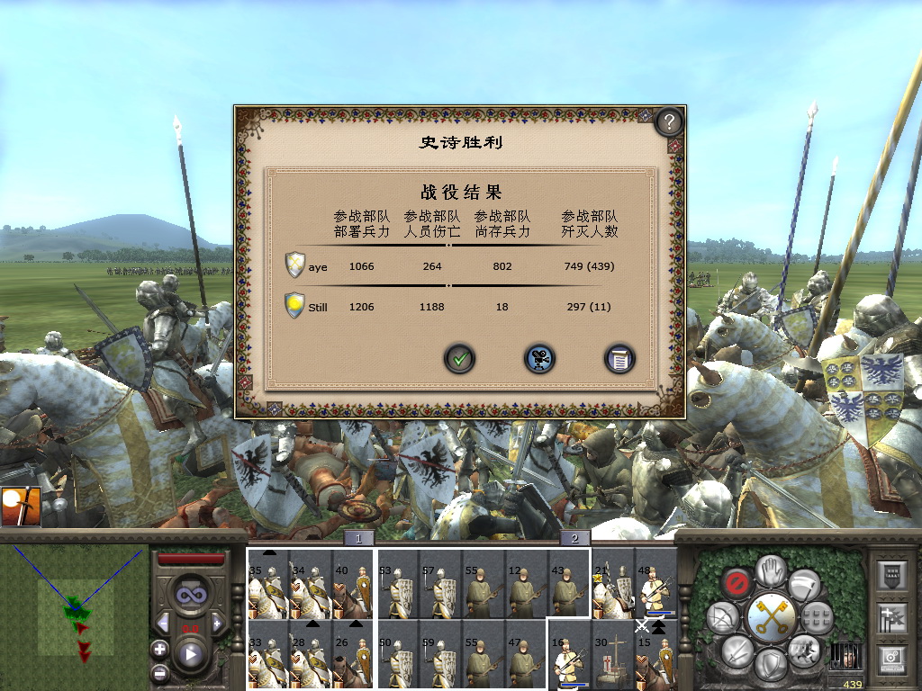 每场战斗后 都有对你的评价 例如一败涂地 惜败 战绩辉煌 史诗胜利等等 史诗胜利是对你的指挥能力的最高褒奖 并会在战略地图上留下一个标记 以此见证你过人的军事天赋